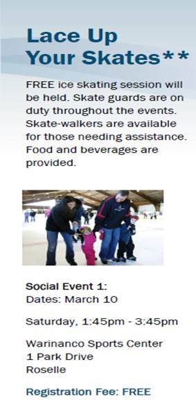 The Union County Board of Chosen Freeholders & the Office for People with Special Needs Presents: Lace Up Your Skates on March 10th on Saturday from 1:45pm to 3:45pm, at the newly renovated Warinanco Sports Center, 1 Park Drive, Roselle.