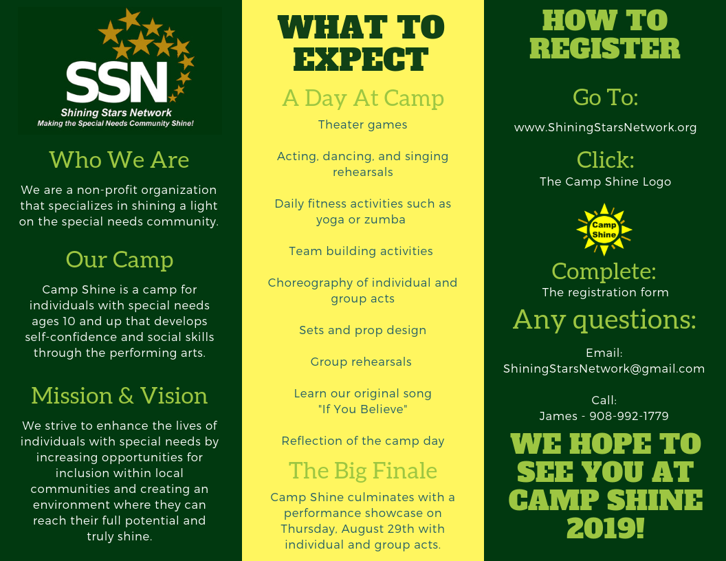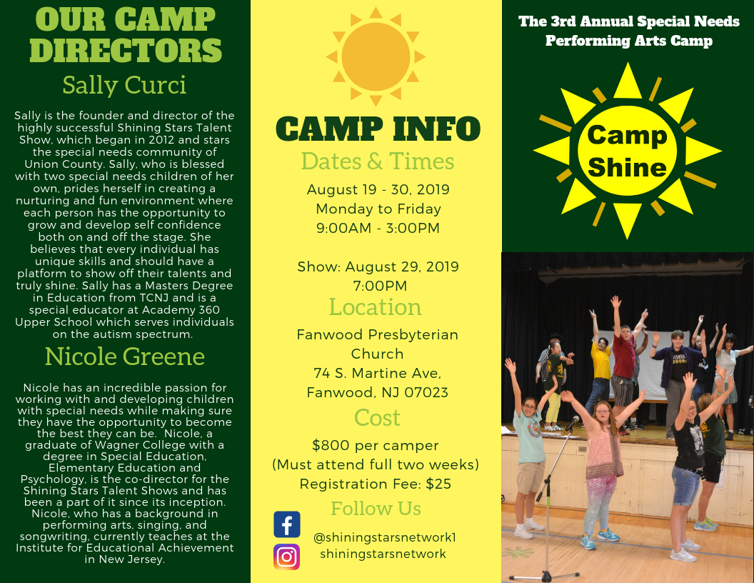 Camp Shine -- a performing arts special needs camp for ages 10 and up -- is set for August 19-30 at the Fanwood Presbyterian Church in Fanwood. Camp Shine is a theater camp for individuals with special needs which increases self-confidence through the performing arts. It is a two week camp which shines a spotlight on the special needs community and is culminated with a performance showcase. The camp focuses on team building, social skills and positivity though acting, singing and dancing.