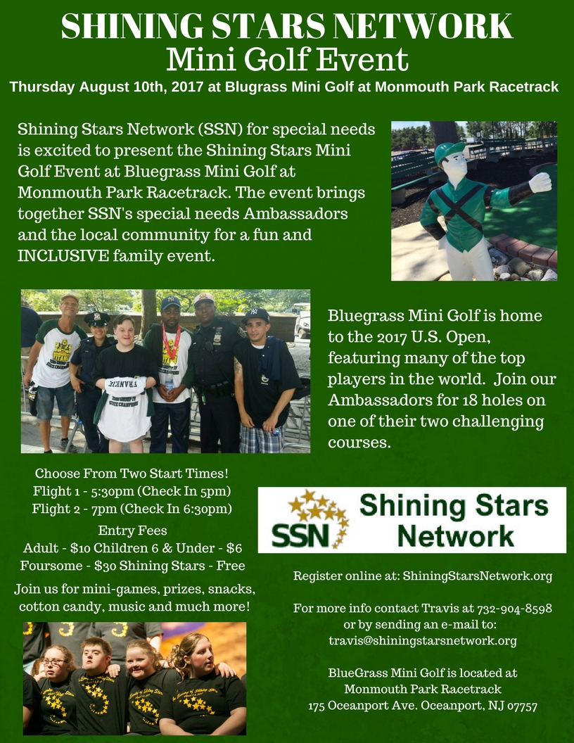 Shining Stars Network is very excited for our Mini Golf Event. This will be a great opportunity for the community and our special needs Ambassadors to casually come together. People of all ages and abilities can all enjoy a great round of mini golf. Check out the flyer below for more info and CLICK HERE TO REGISTER