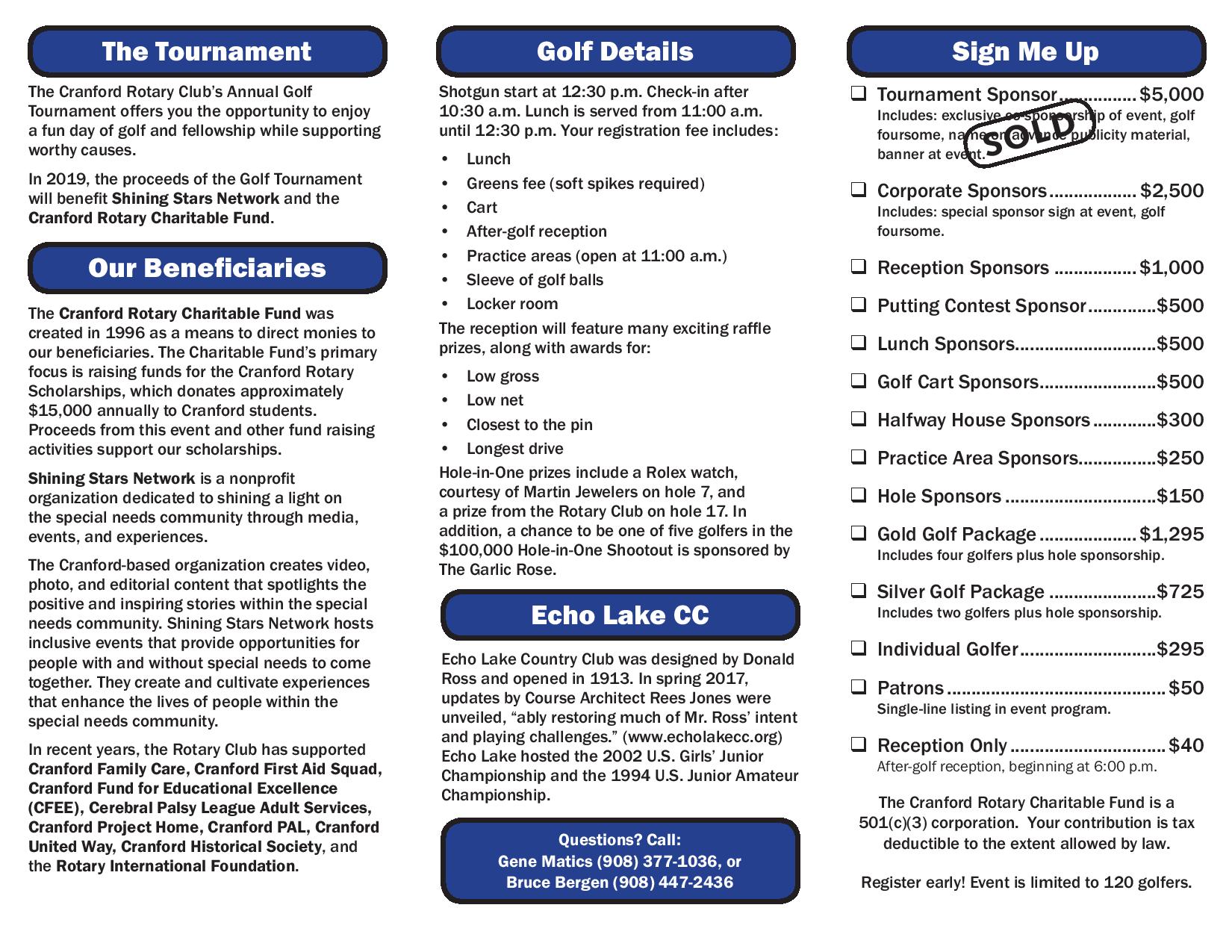 Shining Stars Network has been named by the Cranford Rotary Club as the primary beneficiary of their annual golf fundraiser for 2019 to be held on Monday, May 20, 2019 at the Echo Lake Country Club in Westfield